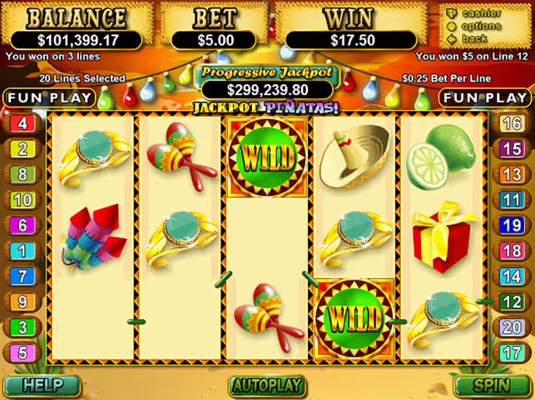 Jackpot Pinatas Slots wraps a regional holiday vibe into a 5-reel, 20-payline video slot that’s built to entertain and pay. With a progressive element and a bonus-filled design from Real Time Gaming, the game mixes familiar party icons—sombreros, maracas, tacos—with jackpot-sized prize potential to keep each spin lively. If you like slots that feel festive and can surprise you on any spin, this one’s worth a look.